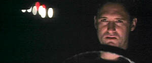 CLOSE UP ON FRED'S FACE - through the front windshield. The shot is wide enough to reveal the cop car in hot pursuit.